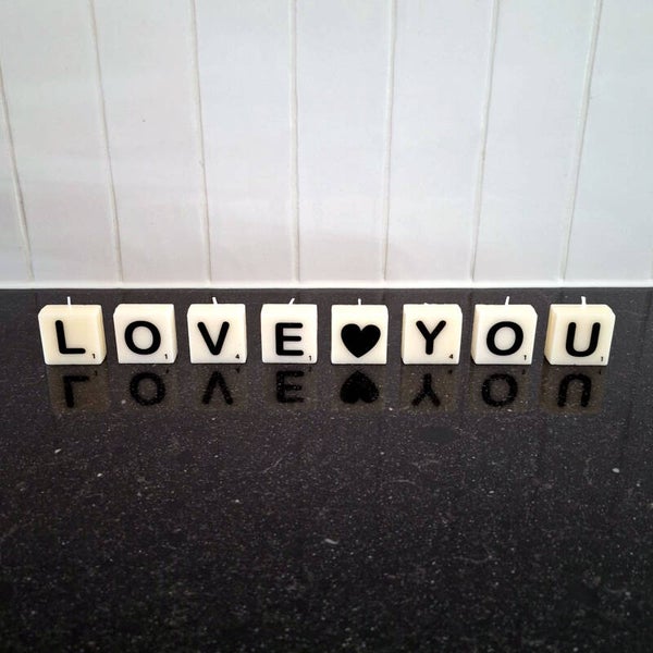 Acht sfeervolle letterkaarsen die samen het woord LOVE of ♥YOU vormen. De kaarsen hebben een speelse scrabble-stijl en worden geleverd met een unieke limited edition Heikens Habitat kaart.